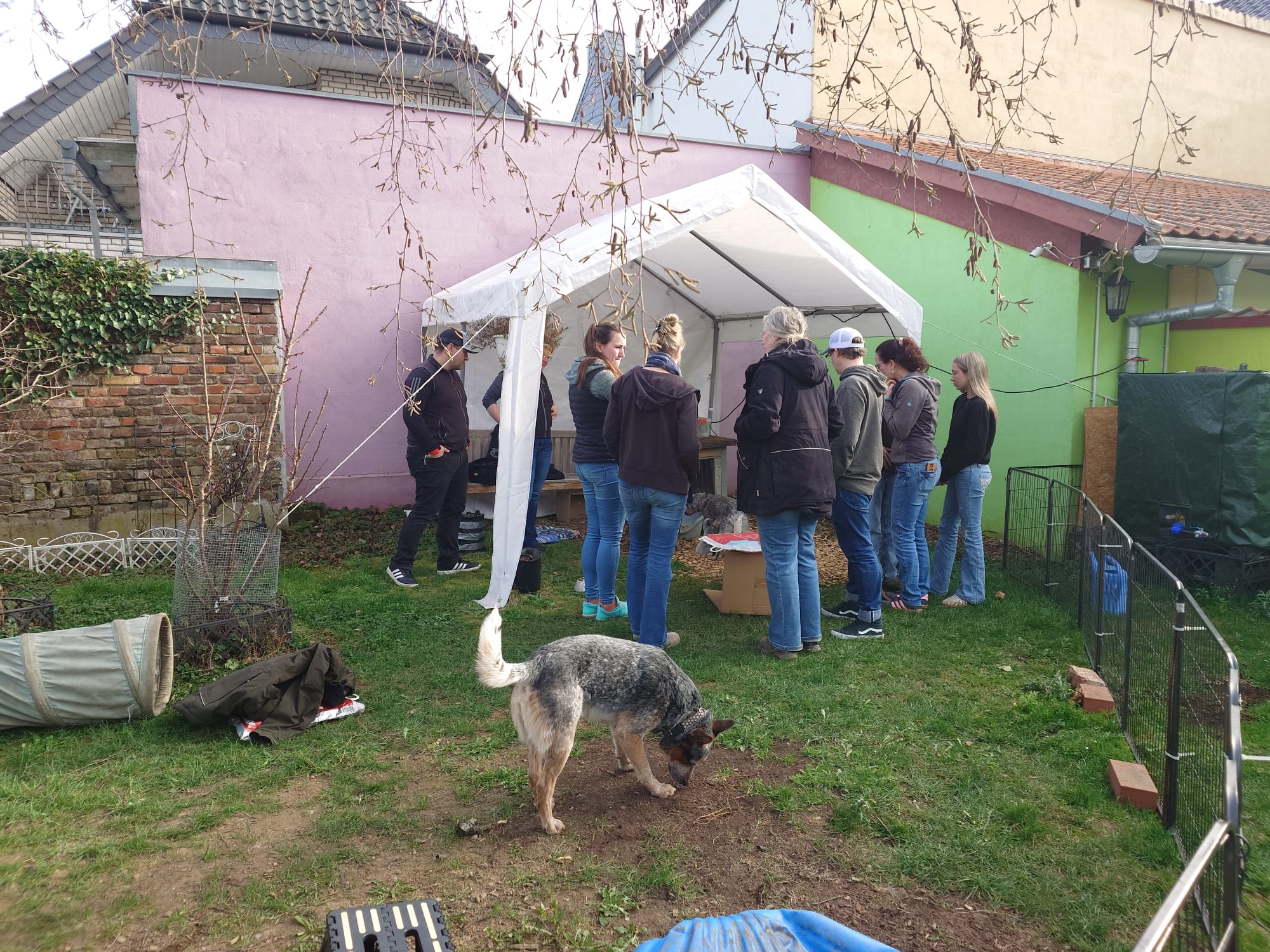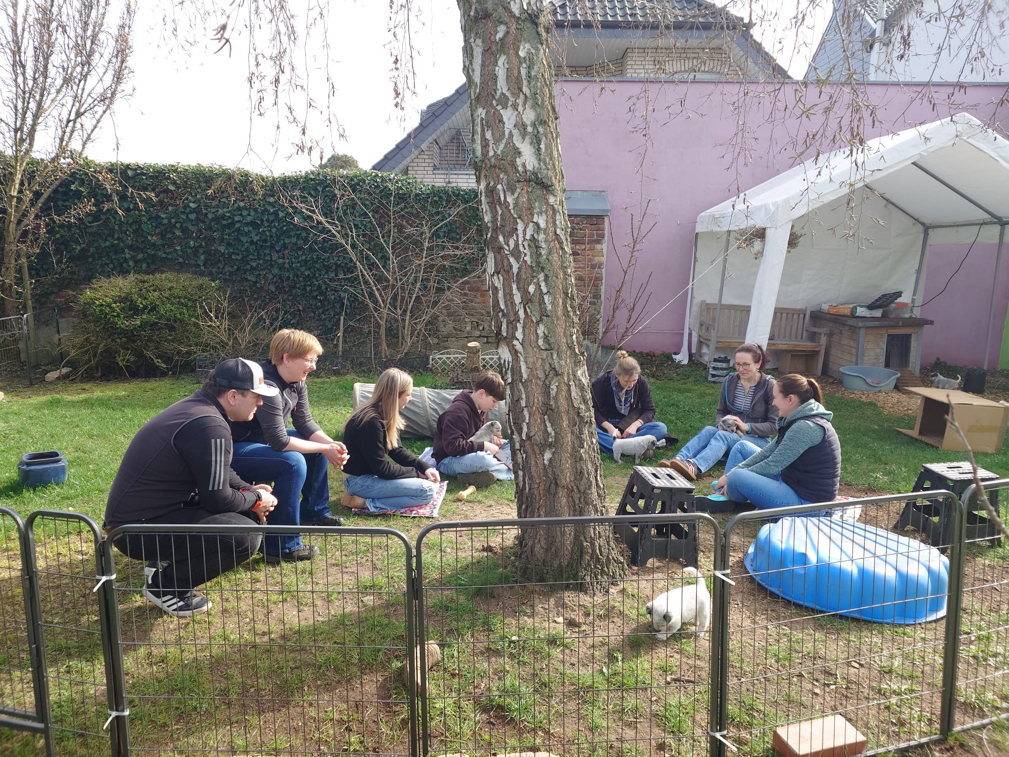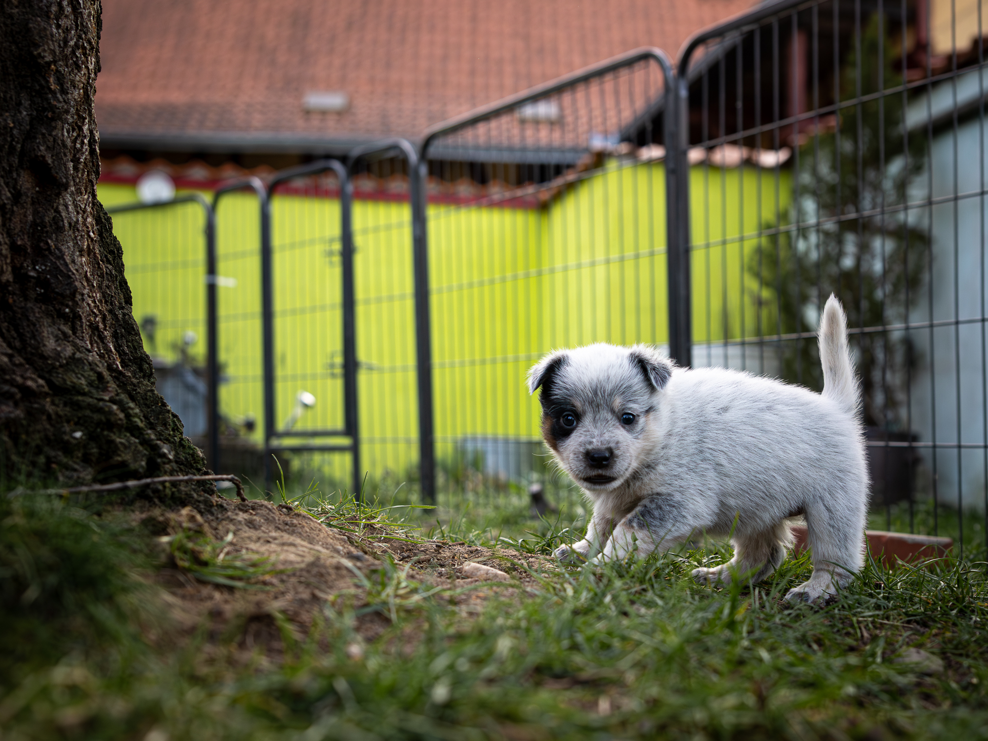 Das Wetter ist sehr schön, so dass die Welpen in der Mitte der 5. Labenswoche tagsüber in den Gartenauslauf dürfen. Die Rampe zur beheizten Hütte kennen sie bereits von der Wurfkiste. Sehr schnell haben sie den kompletten Auslauf erobert. Fenves toleriert zunehmend auch die anderen Hunde, Josie, Izzy und Flint haben viel Interesse an den Welpen.