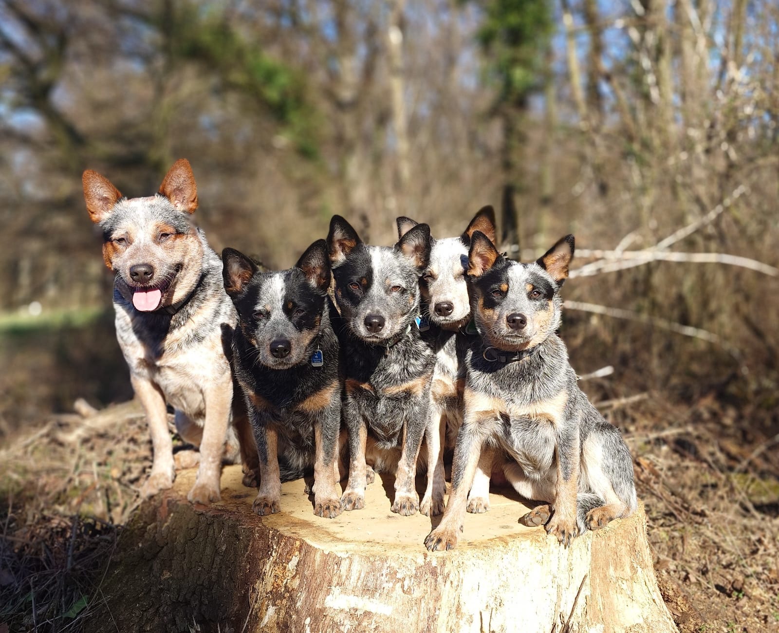Auch mit 2 Personen schafft man Corona-konforme Spaziergänge mit vielen Cattledogs, Tyla (Forelands Cute Tyla) war für ein paar Tage zu Besuch und Jupp (Horseman´s Buddies Cotton Eye Joe) fand 4 Mädels als Gassi-Partner super.