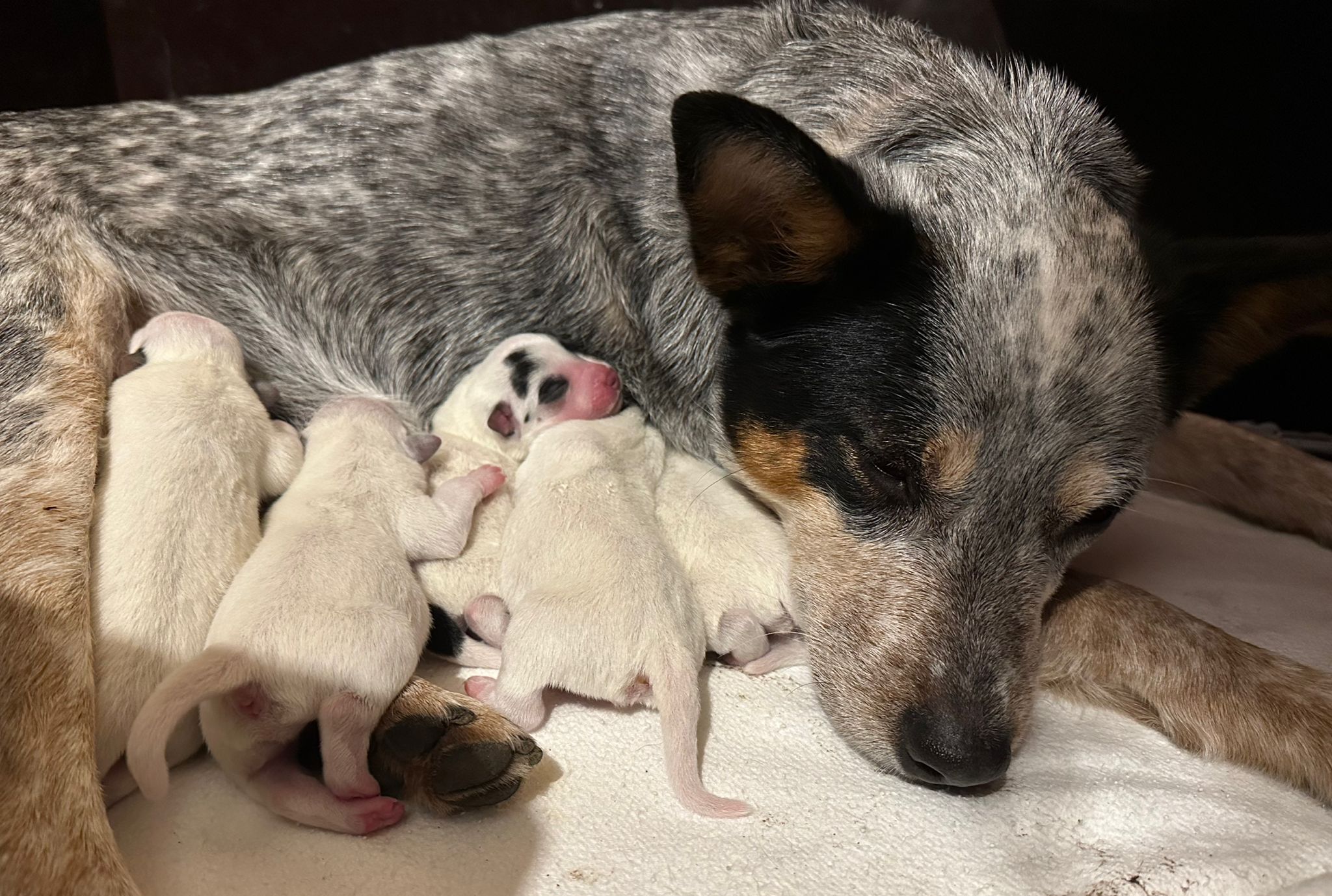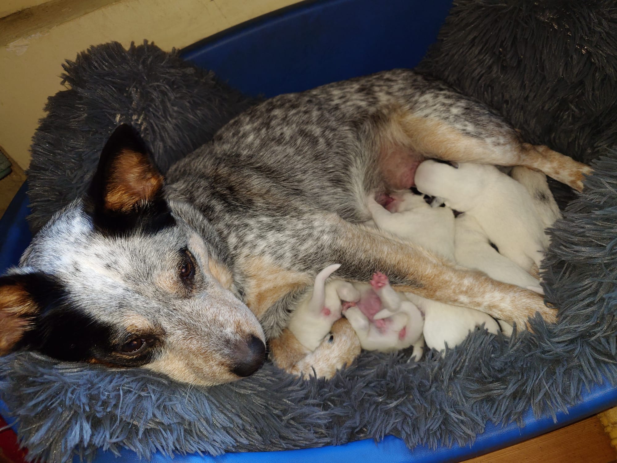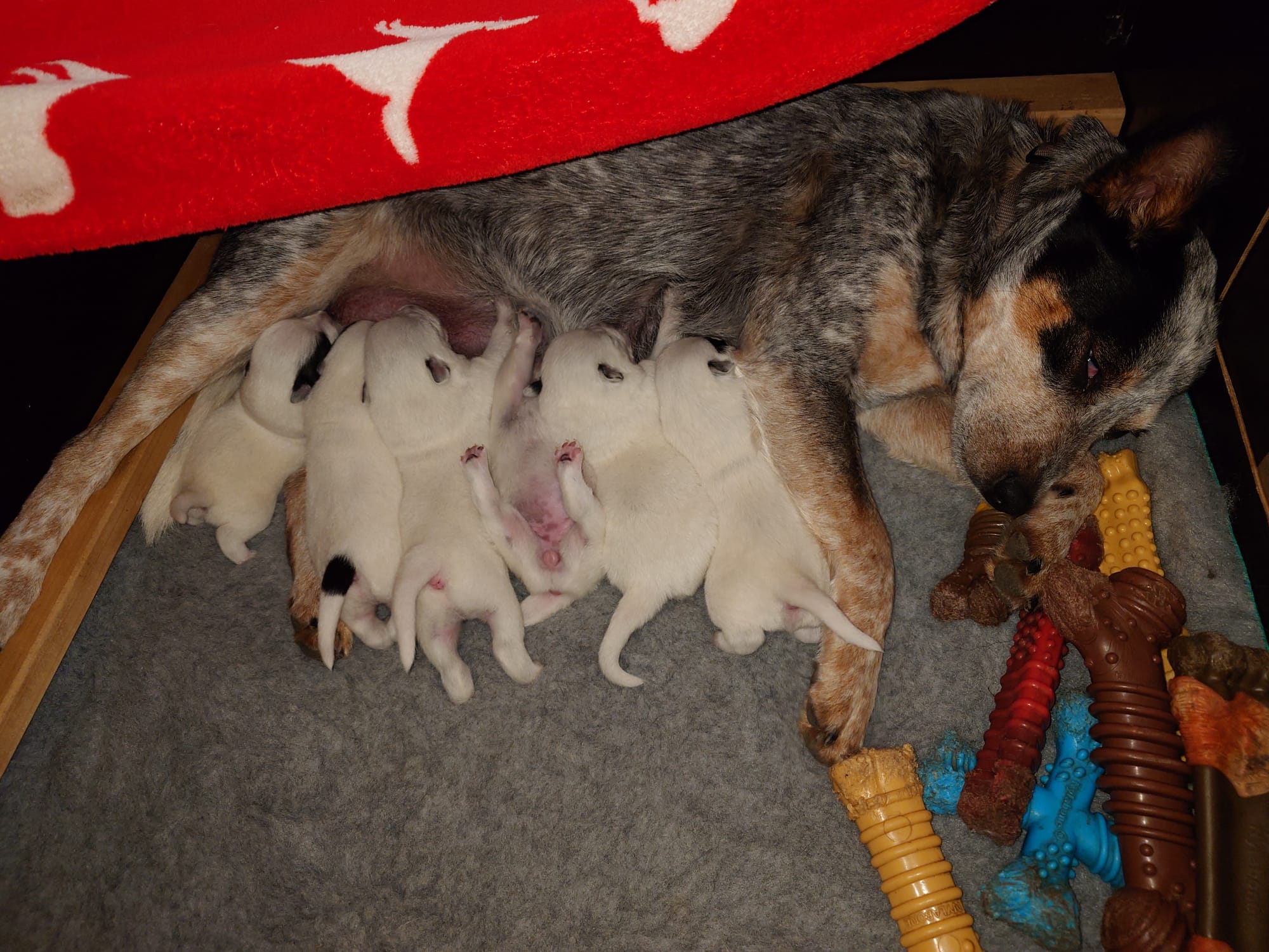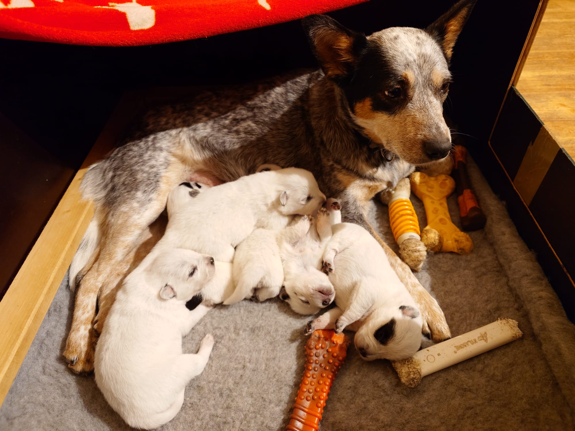 In den frühen Morgenstunden des 01.02.2026 hat Fenves innerhalb von 4 Stunden 6 kleine Cattledog-Mädels zur Welt gebracht. Die Geburtsgewichte lagen zwischen 207g und 307g. Alle Welpen sind putzfit und Fenves versorgt sie liebevoll.