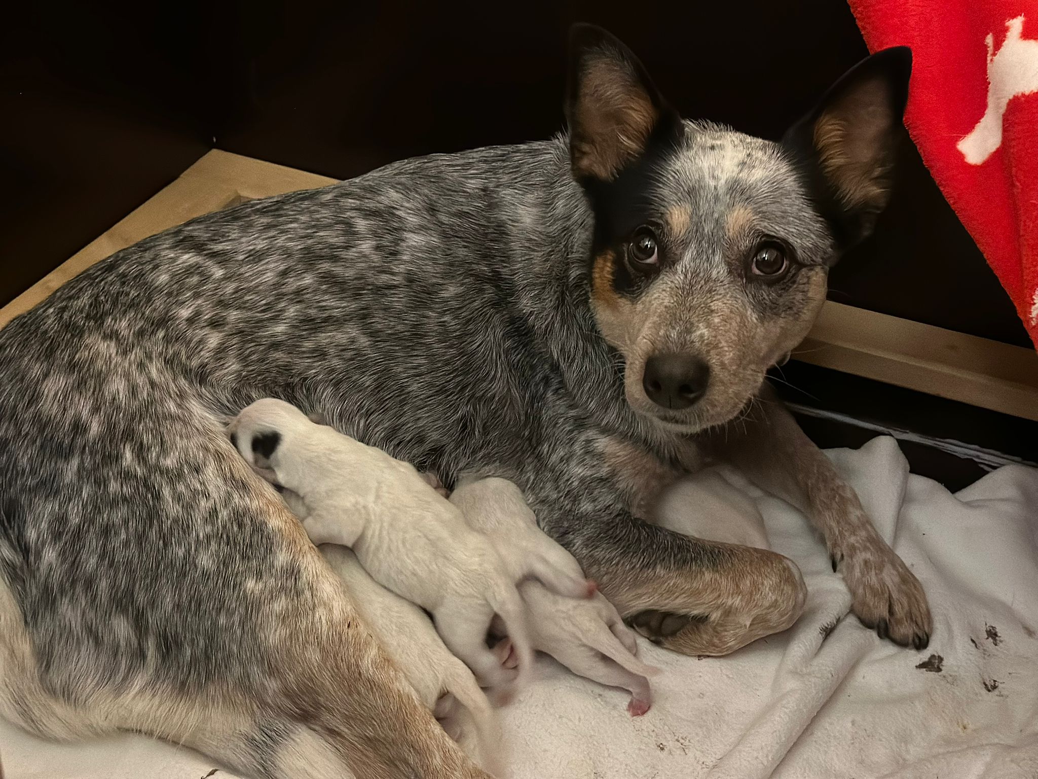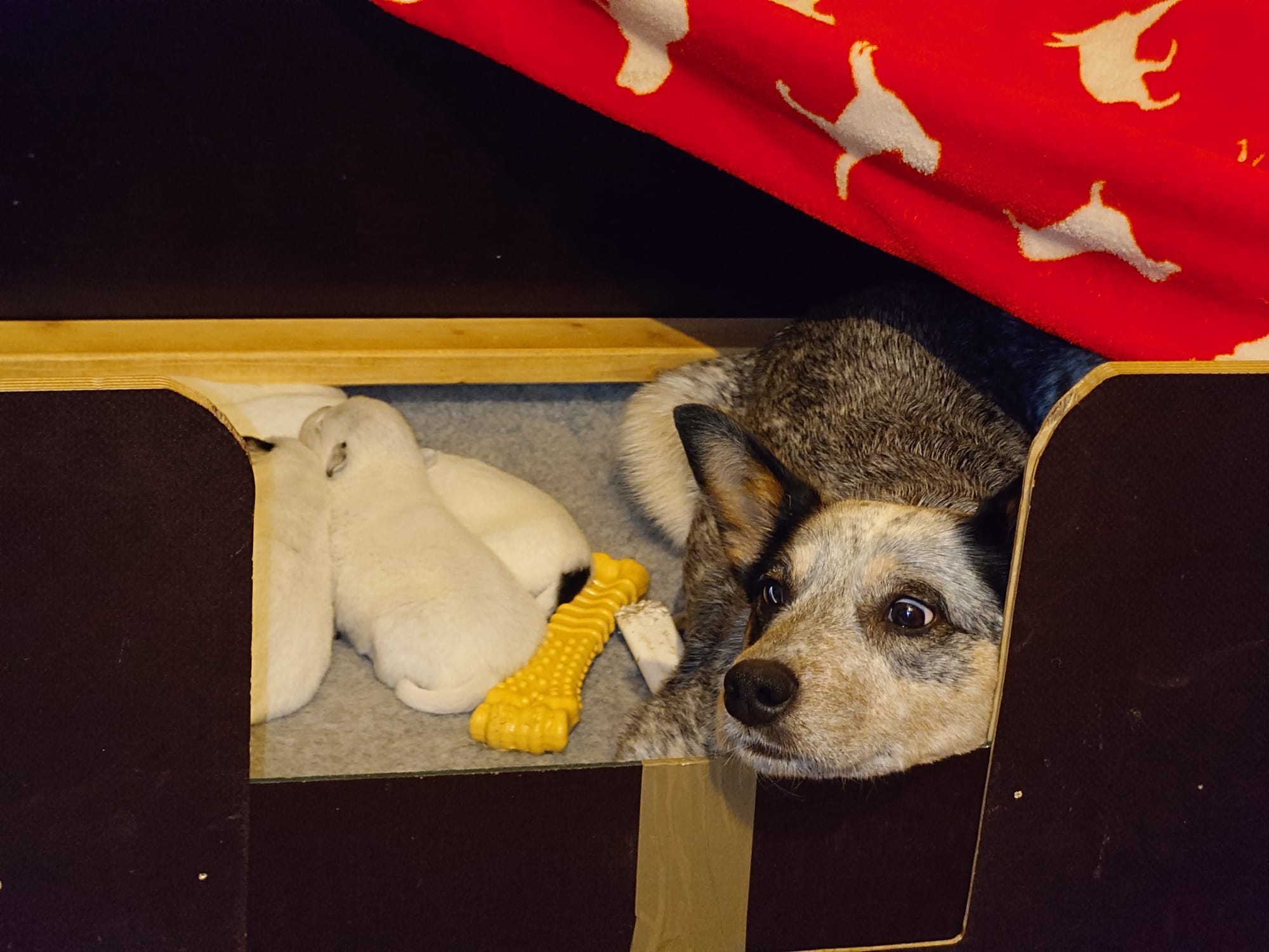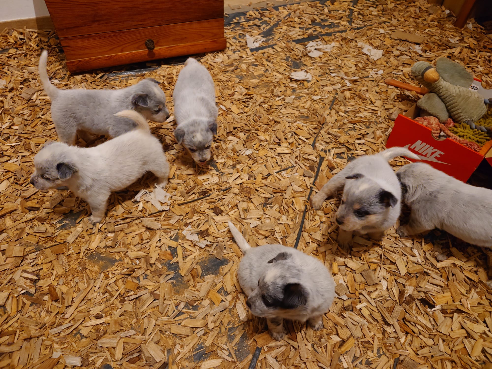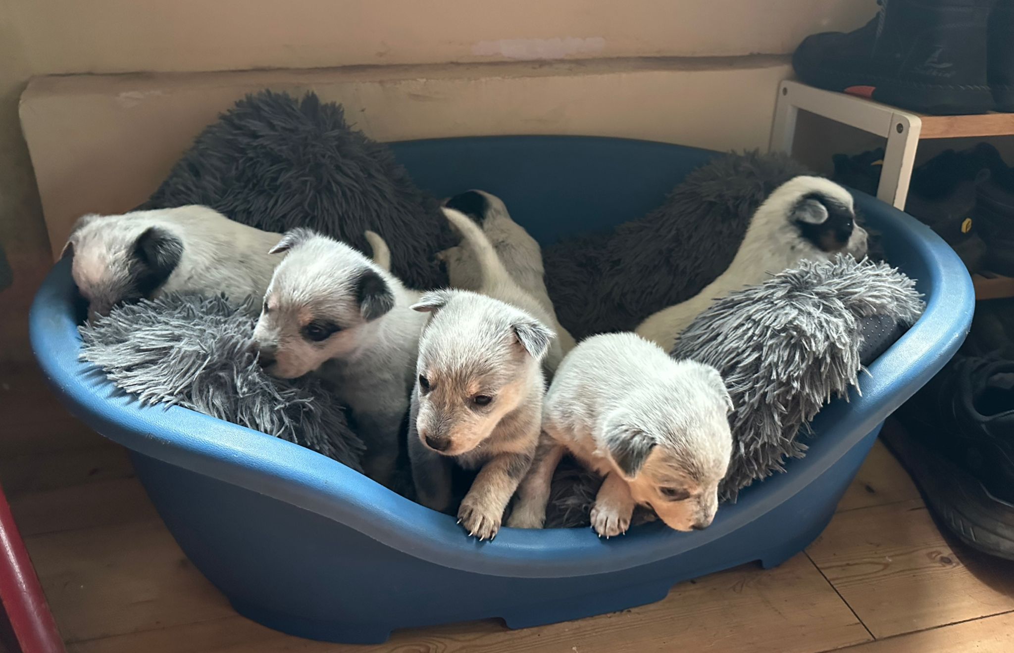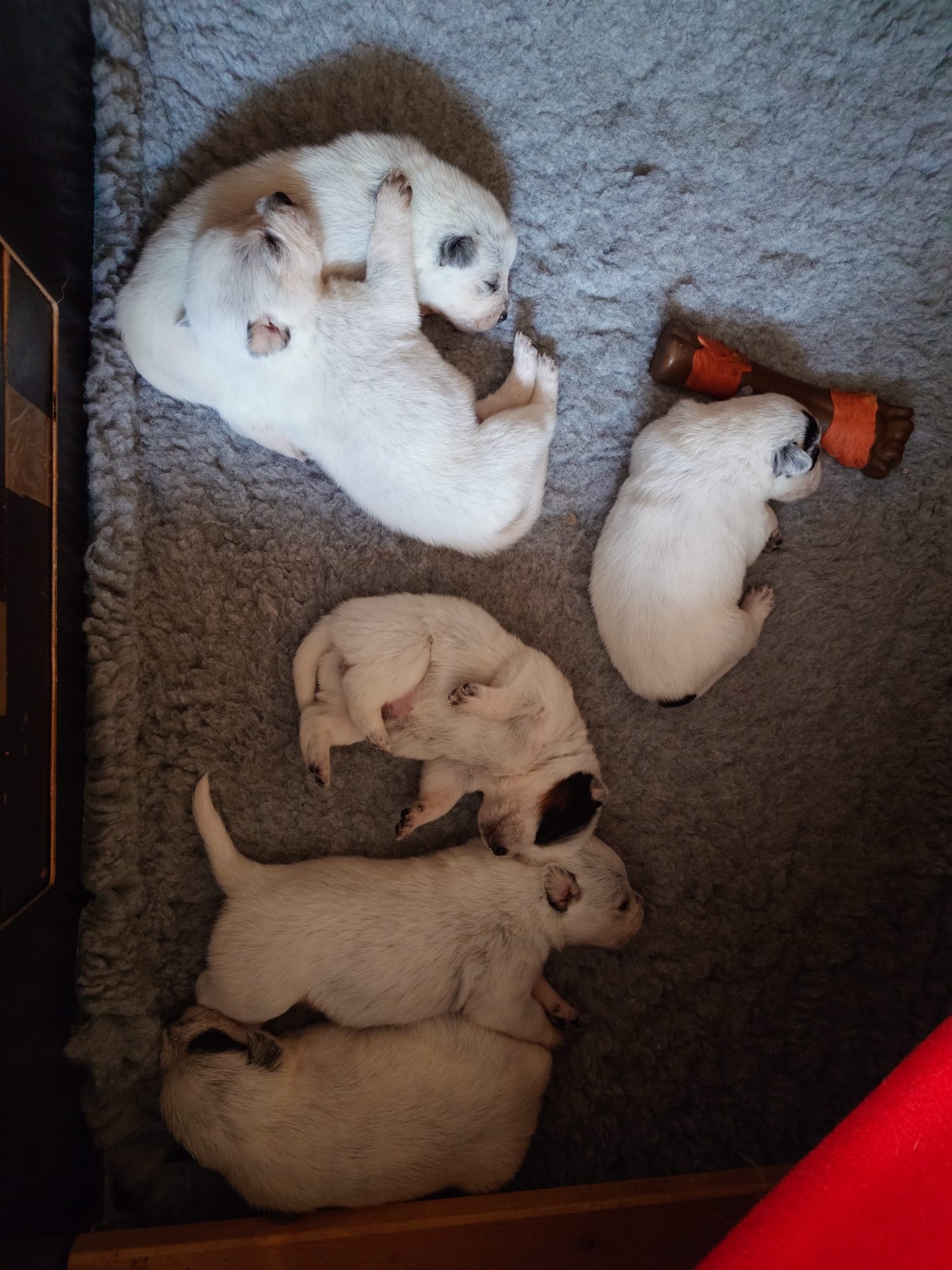 In den frühen Morgenstunden des 01.02.2026 hat Fenves innerhalb von 4 Stunden 6 kleine Cattledog-Mädels zur Welt gebracht. Die Geburtsgewichte lagen zwischen 207g und 307g. Alle Welpen sind putzfit und Fenves versorgt sie liebevoll.