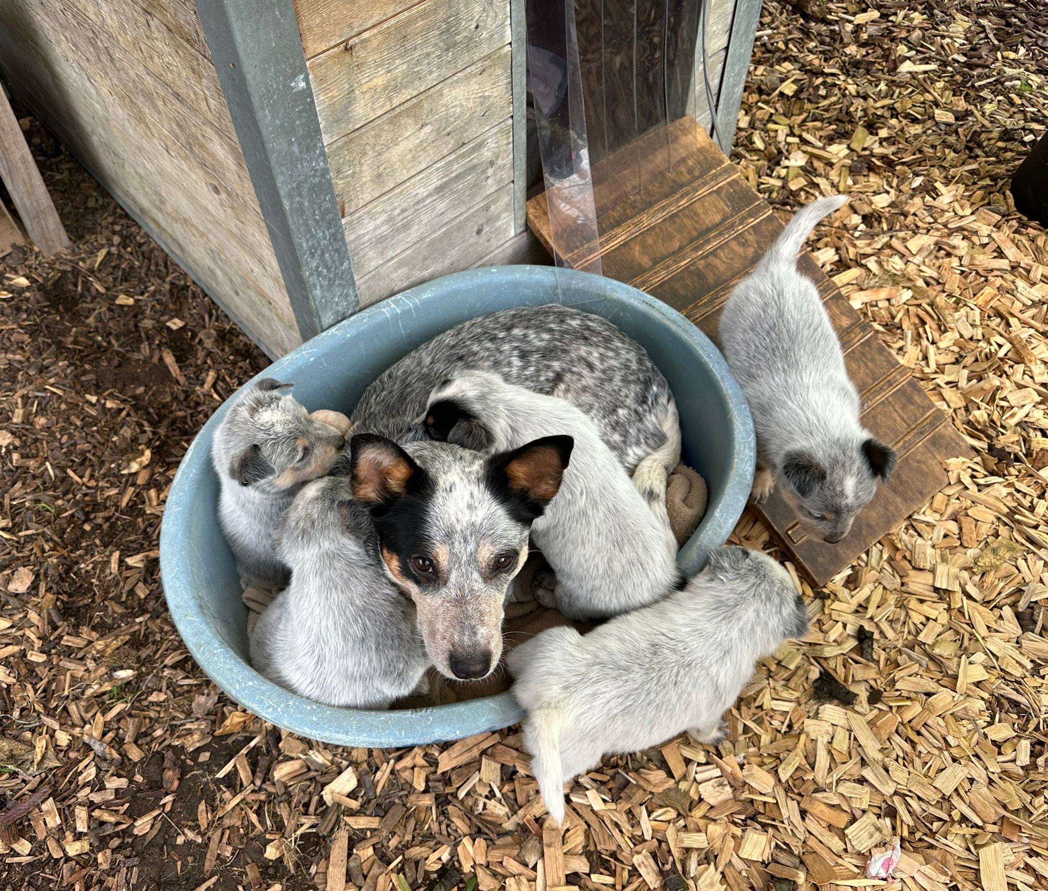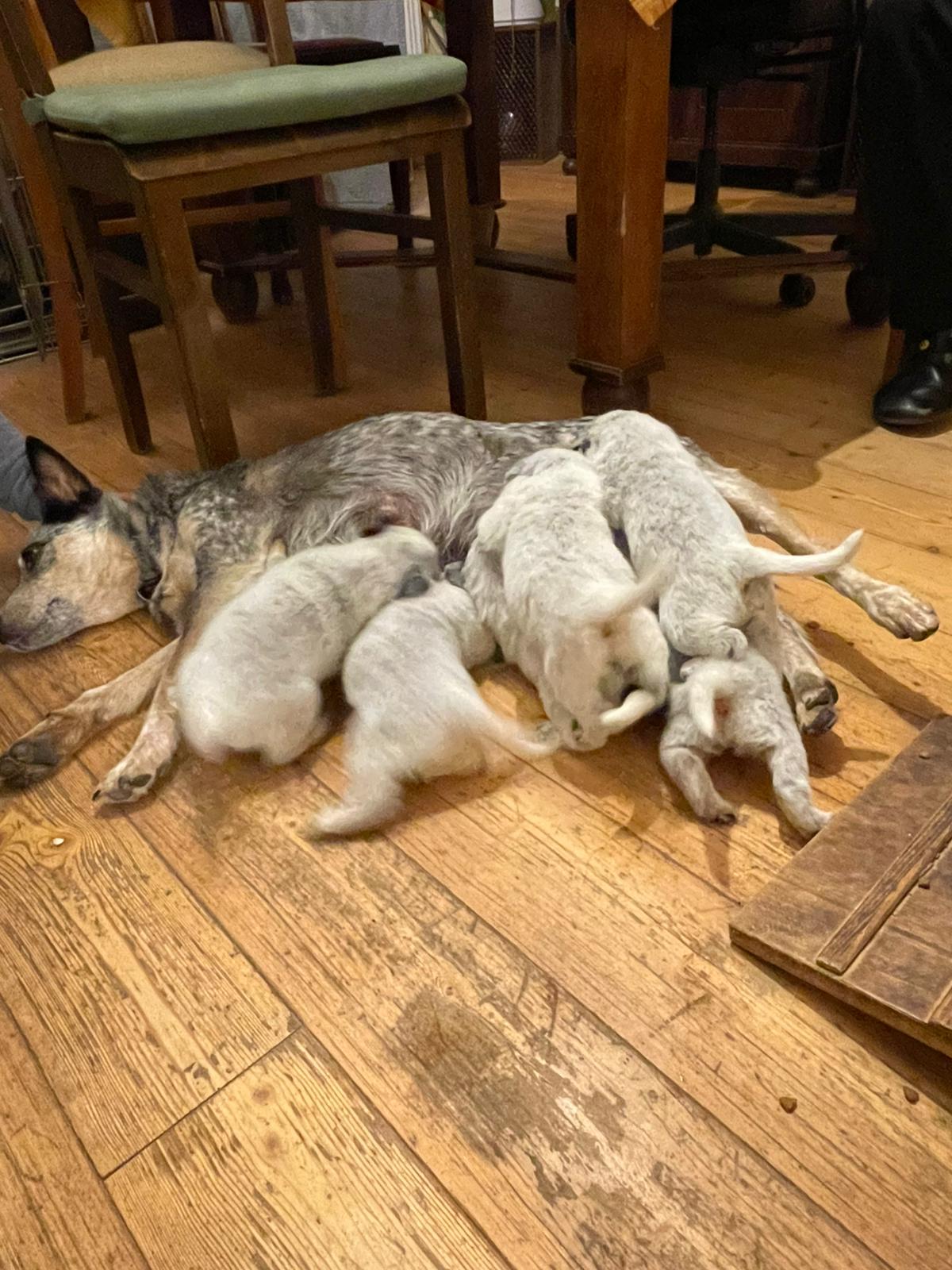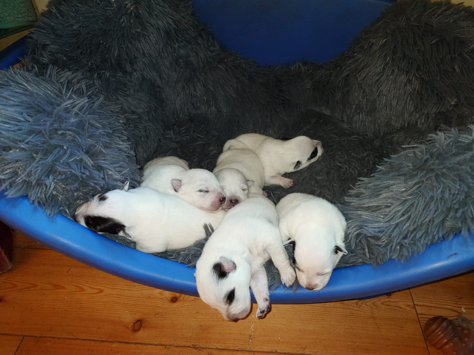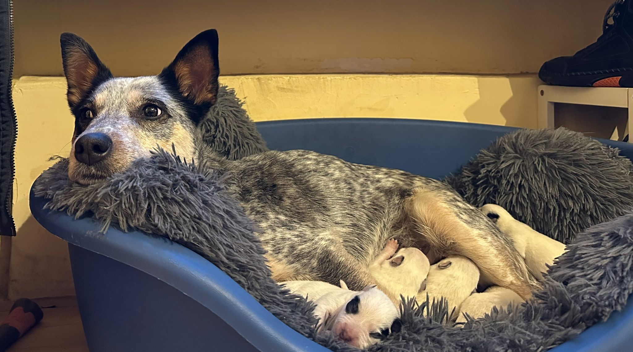 In den frühen Morgenstunden des 01.02.2026 hat Fenves innerhalb von 4 Stunden 6 kleine Cattledog-Mädels zur Welt gebracht. Die Geburtsgewichte lagen zwischen 207g und 307g. Alle Welpen sind putzfit und Fenves versorgt sie liebevoll.