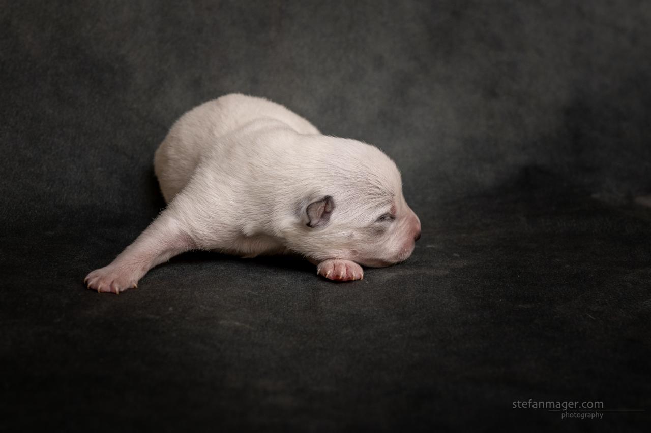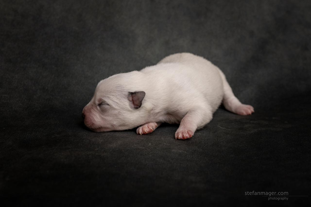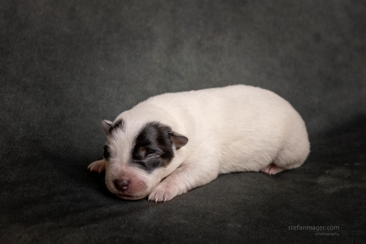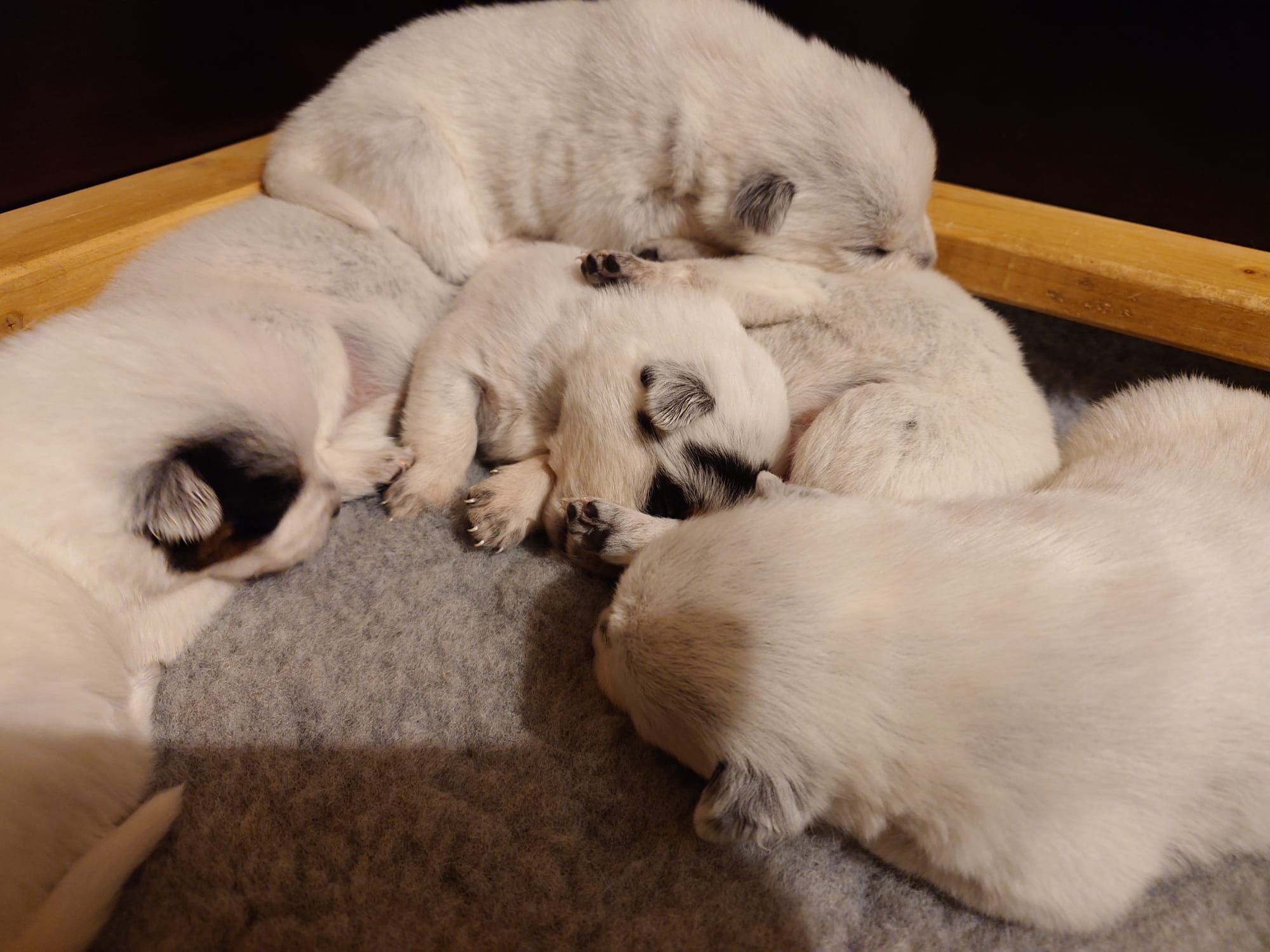 In der dritten Lebenswoche nehmen die Welpen ordentlich an Gewicht zu und die Farbabzeichen schimmern bereits durch das weiße Fell hindurch. Fenves ist sehr entspannt wenn Besucher kommen und ihre Welpen auf den Arm nehmen. Sie begleitet uns bereits die ganze Woche wieder auf kürzeren Spaziergängen, länger als eine Stunde mag Fenves die Kleinen jedoch nicht alleine lassen.