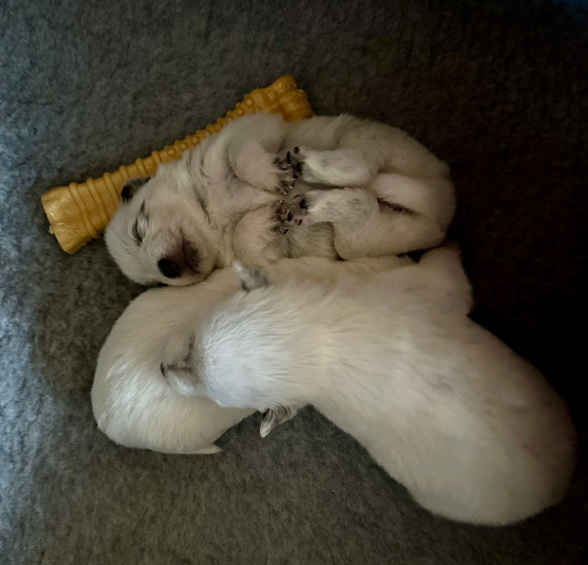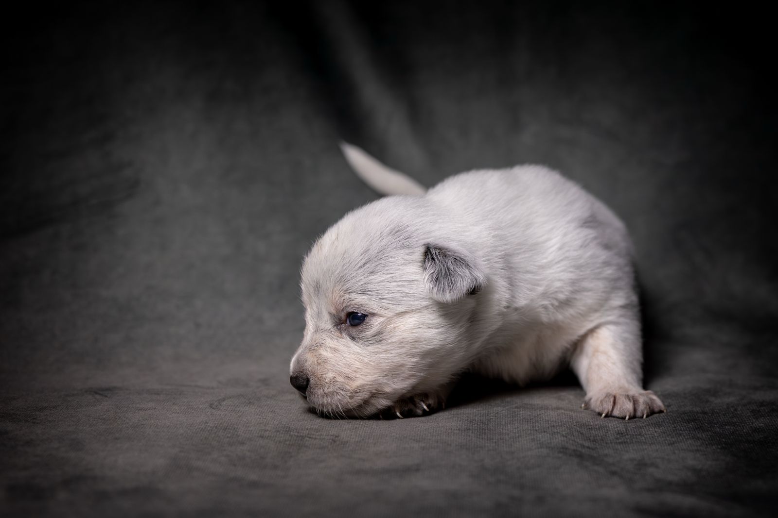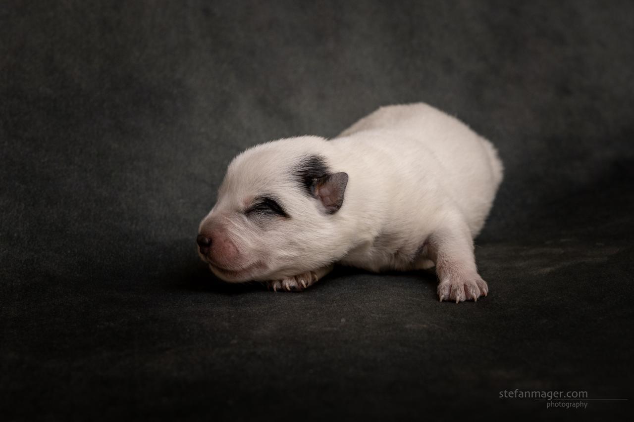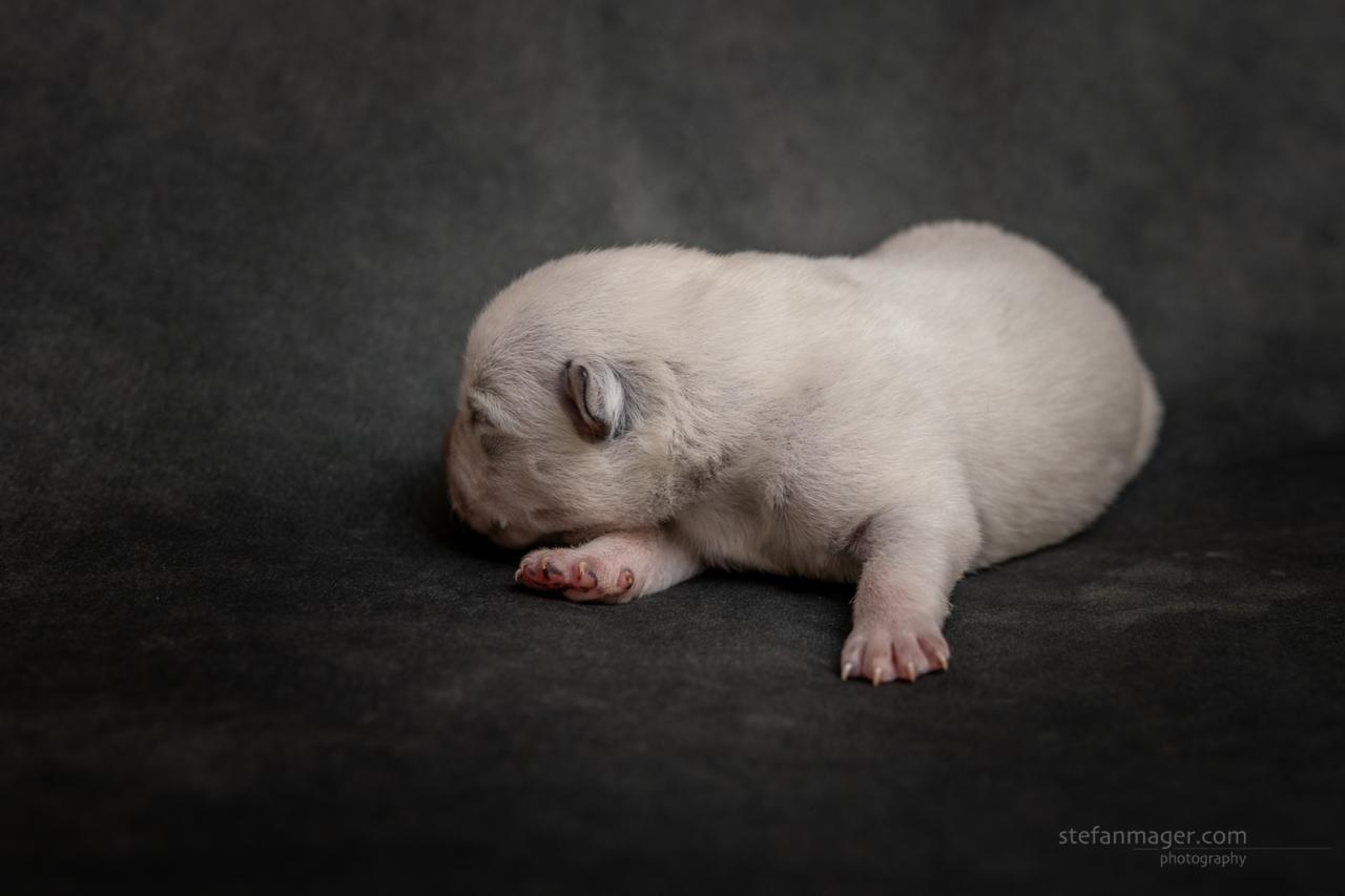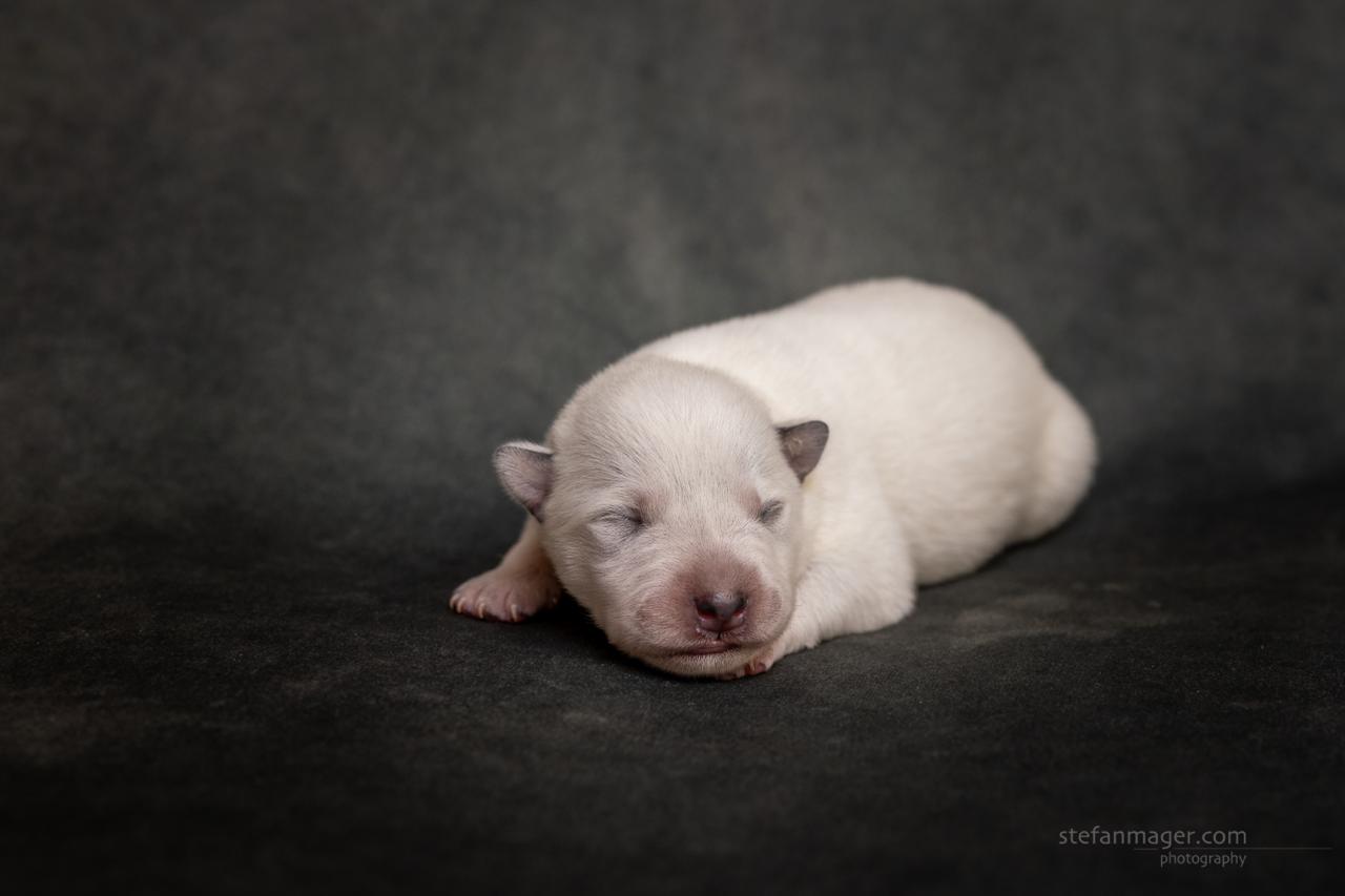 In der dritten Lebenswoche nehmen die Welpen ordentlich an Gewicht zu und die Farbabzeichen schimmern bereits durch das weiße Fell hindurch. Fenves ist sehr entspannt wenn Besucher kommen und ihre Welpen auf den Arm nehmen. Sie begleitet uns bereits die ganze Woche wieder auf kürzeren Spaziergängen, länger als eine Stunde mag Fenves die Kleinen jedoch nicht alleine lassen.