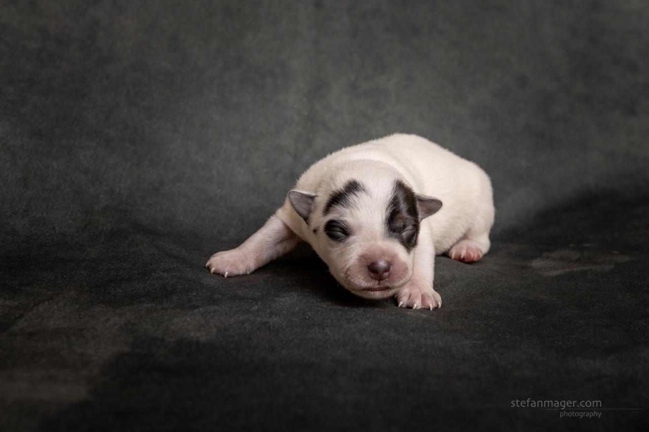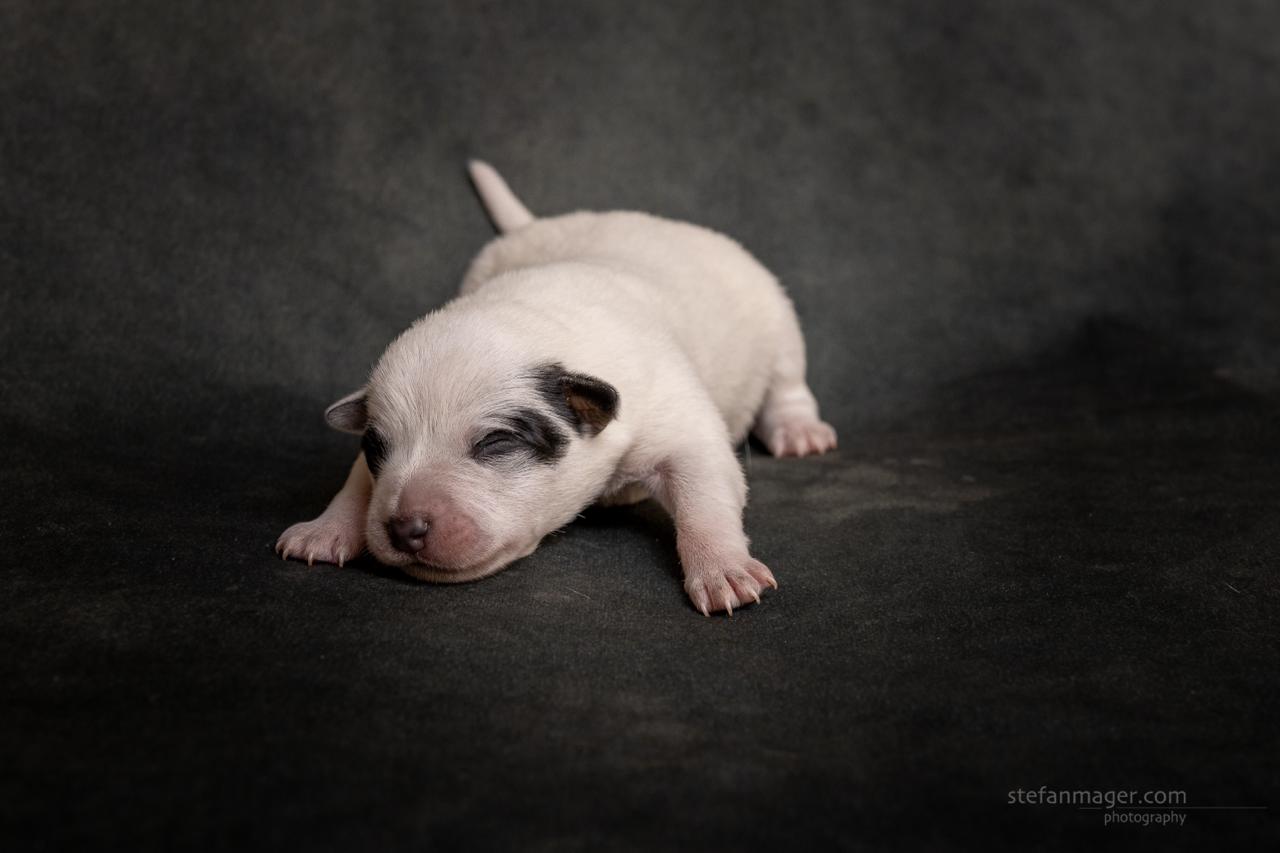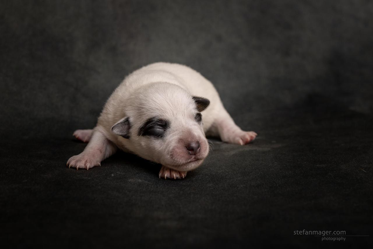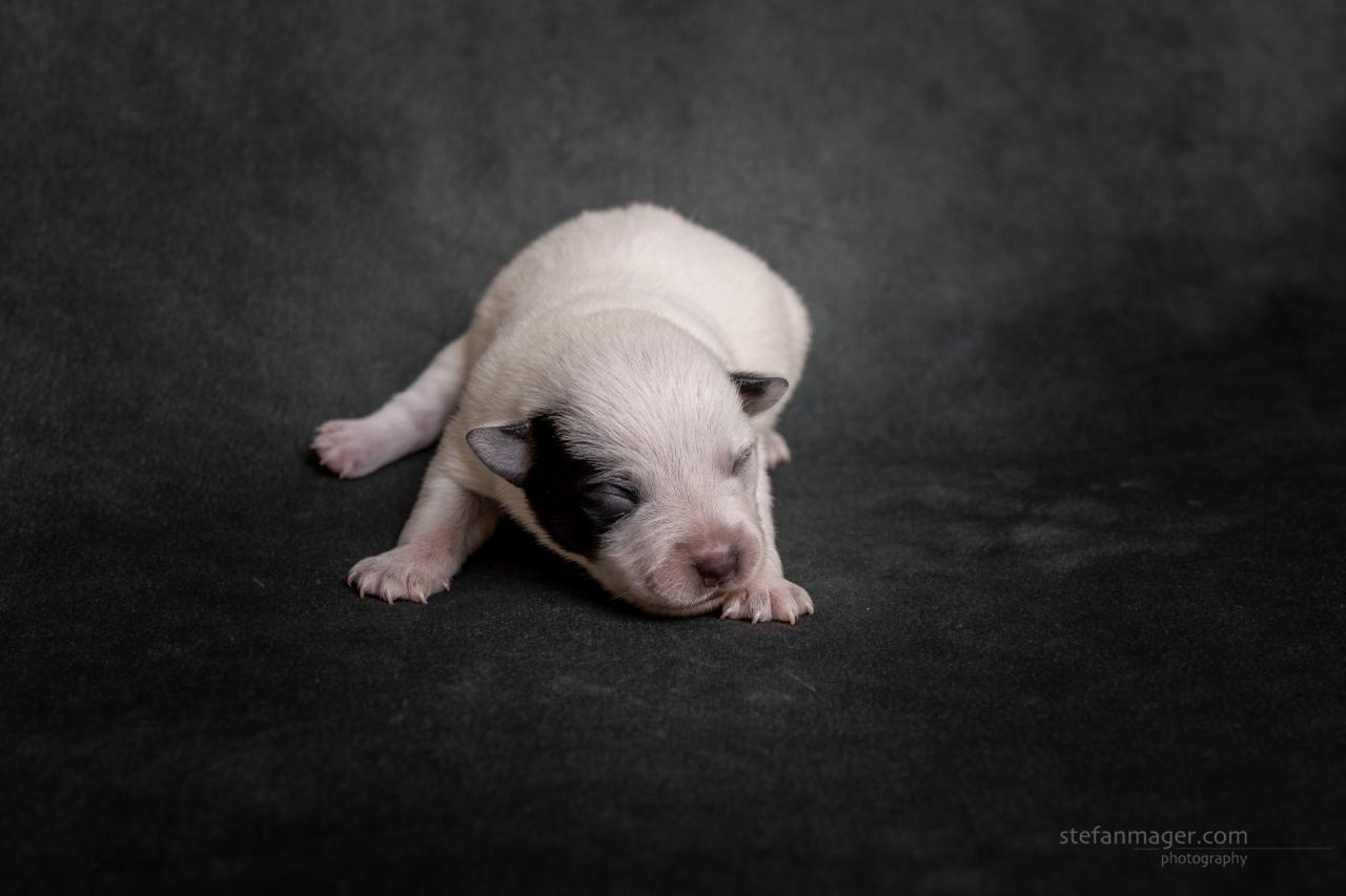 In der dritten Lebenswoche nehmen die Welpen ordentlich an Gewicht zu und die Farbabzeichen schimmern bereits durch das weiße Fell hindurch. Fenves ist sehr entspannt wenn Besucher kommen und ihre Welpen auf den Arm nehmen. Sie begleitet uns bereits die ganze Woche wieder auf kürzeren Spaziergängen, länger als eine Stunde mag Fenves die Kleinen jedoch nicht alleine lassen.