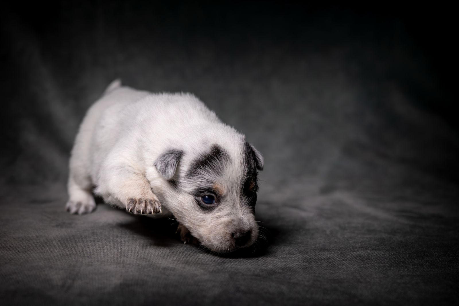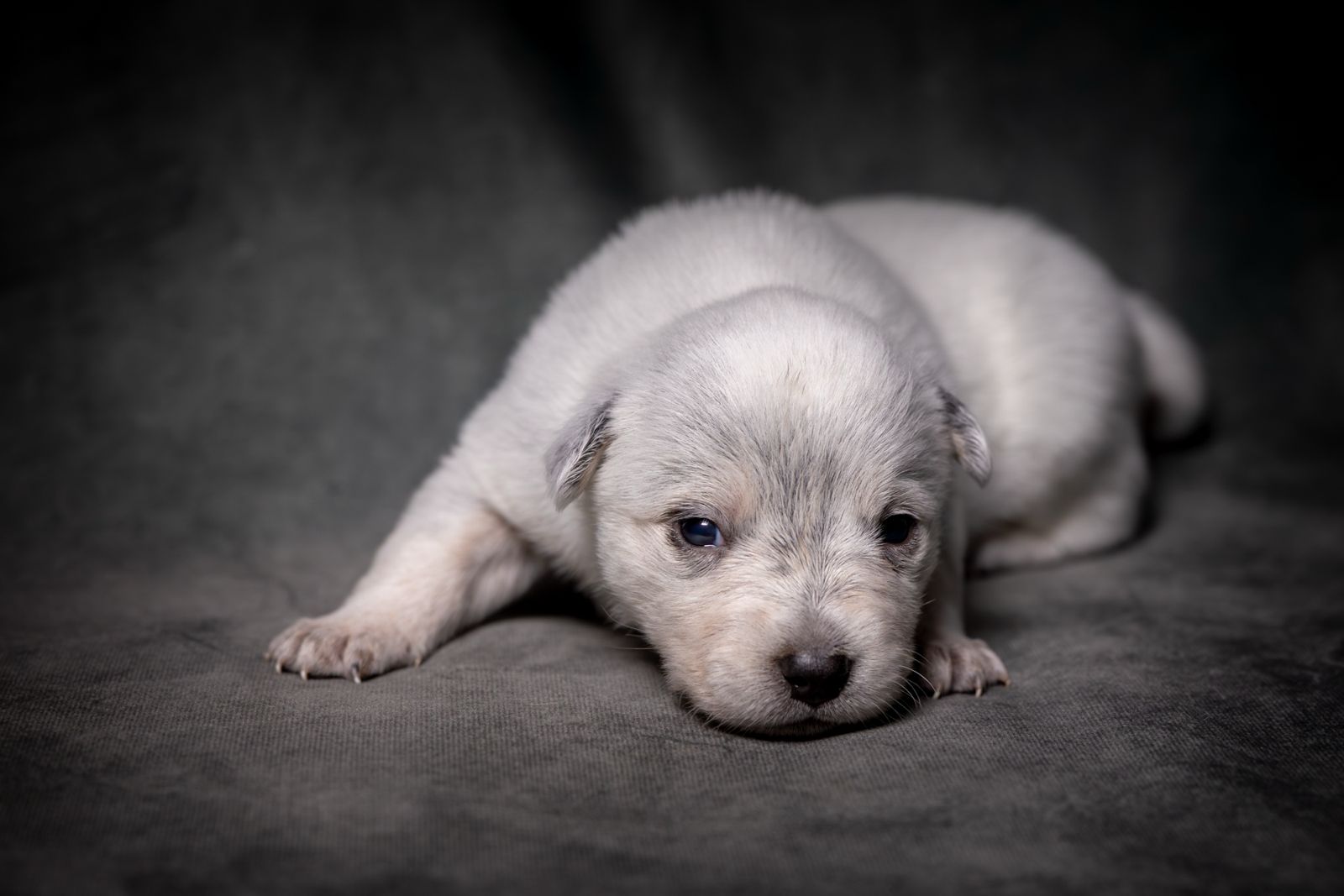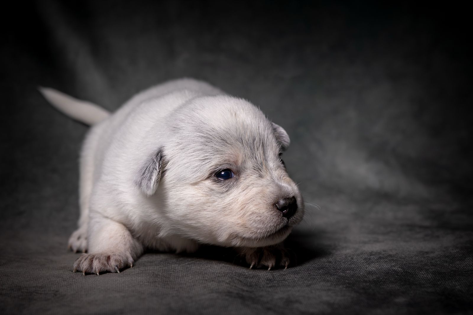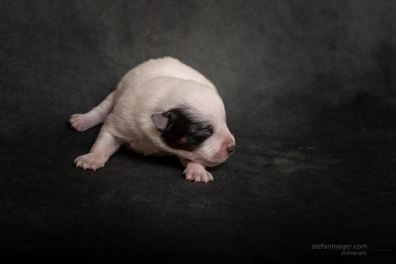 In der dritten Lebenswoche nehmen die Welpen ordentlich an Gewicht zu und die Farbabzeichen schimmern bereits durch das weiße Fell hindurch. Fenves ist sehr entspannt wenn Besucher kommen und ihre Welpen auf den Arm nehmen. Sie begleitet uns bereits die ganze Woche wieder auf kürzeren Spaziergängen, länger als eine Stunde mag Fenves die Kleinen jedoch nicht alleine lassen.