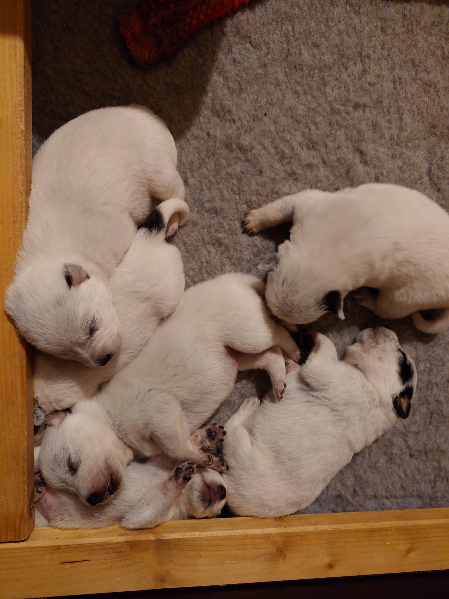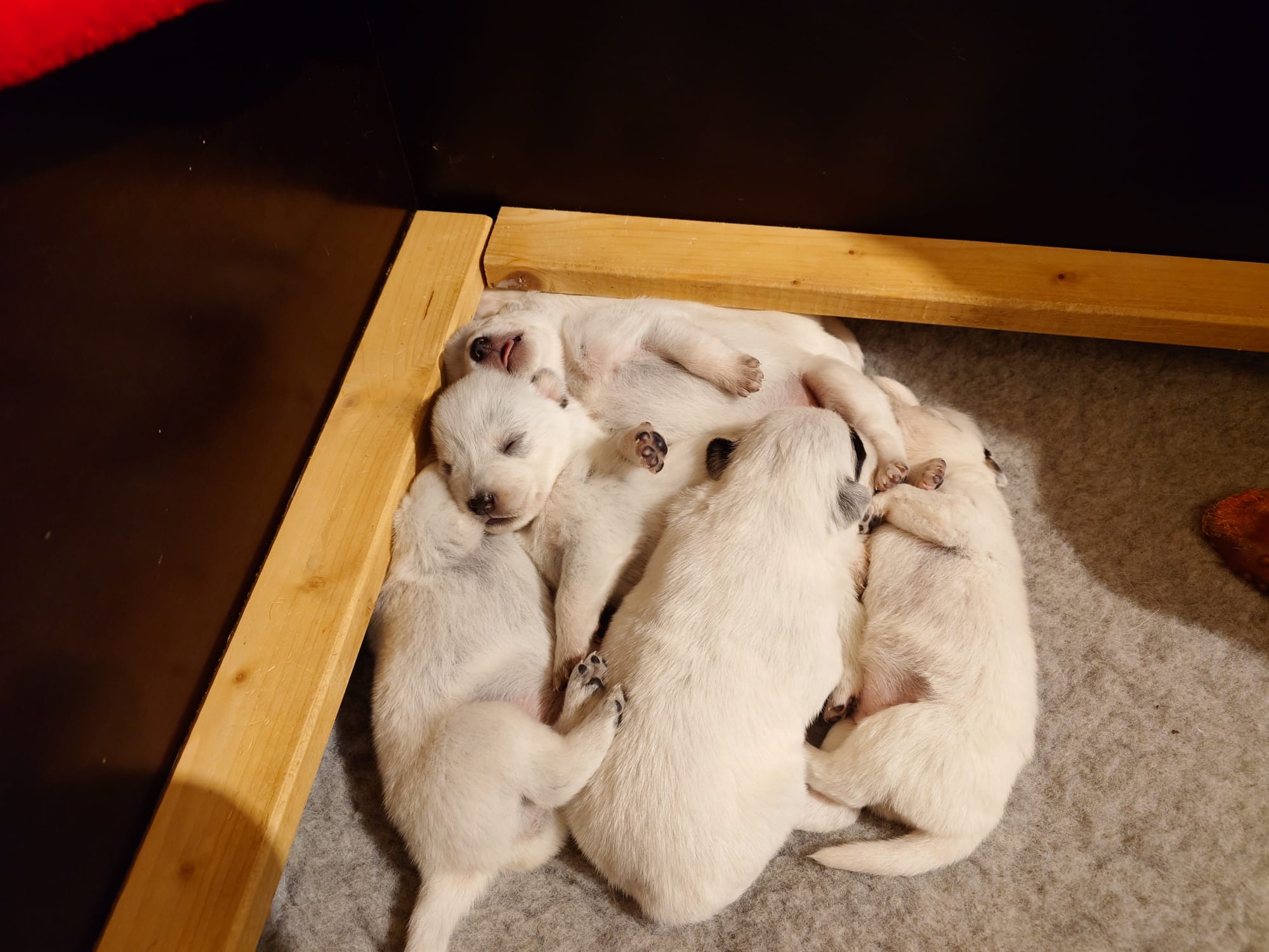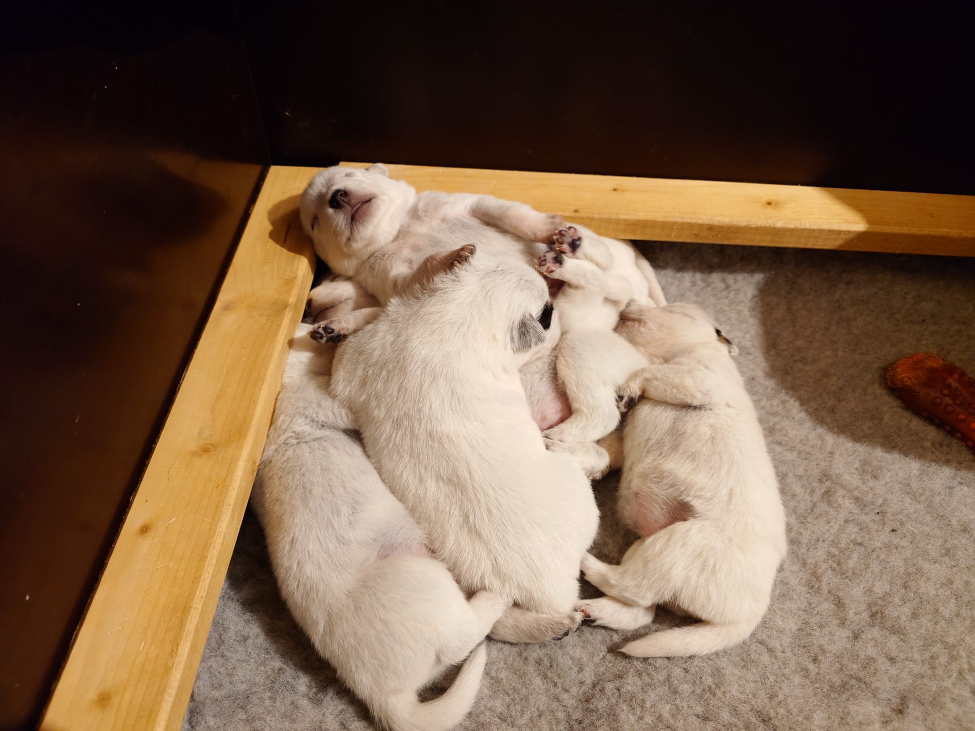 Die erste Lebenswoche haben die sechs Mädels gut überstanden. Fenves wollte anfangs lieber mit ihnen im Korb liegen, nach 2 Tagen wurde es aber doch eng und sie musste häufig abgestürzte Welpen zurück in den Korb tragen. Nun hat sie sich doch mit der komfortableren Wurfkiste arrangiert. Josie darf nun auch schon mal nach den Kleinen schauen.